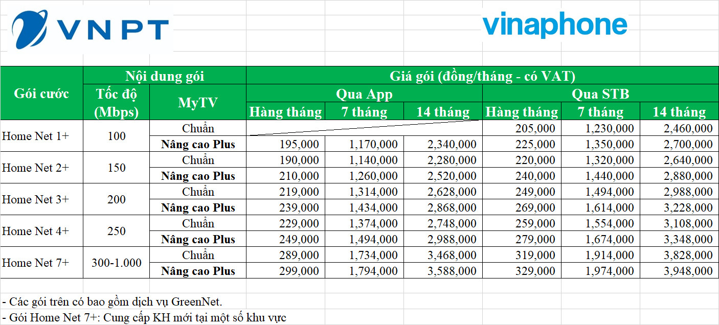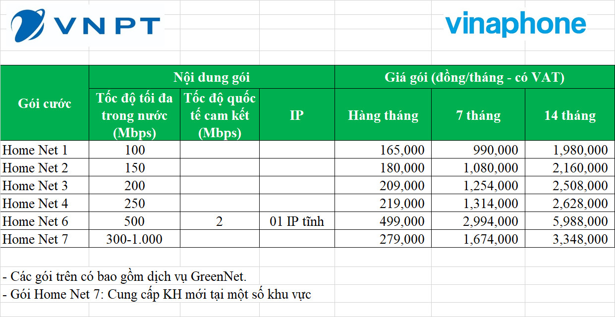 | Home 1 | Internet: 200Mbps | 165.000 VNĐ | 990.000 VNĐ | 1.980.000 VNĐ |
