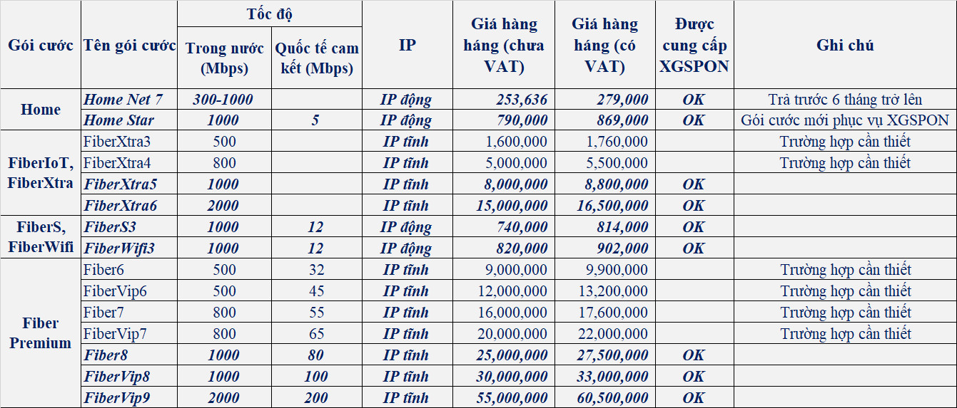 | DANH MỤC GÓI INTERNET CÁP QUANG | ||||