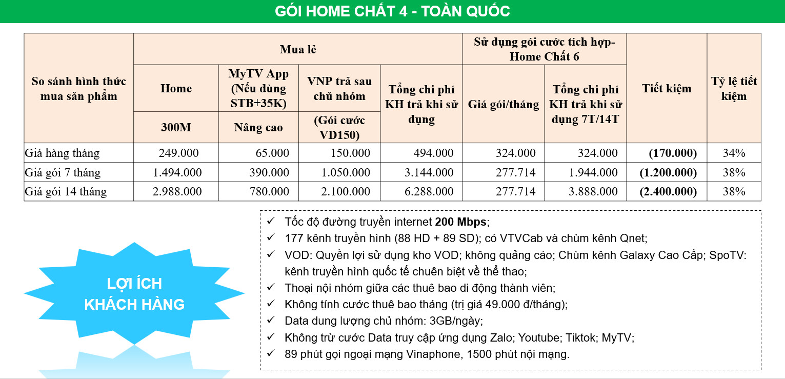 - Home Net 4: Tốc độ 250Mbps, giá 219k.
