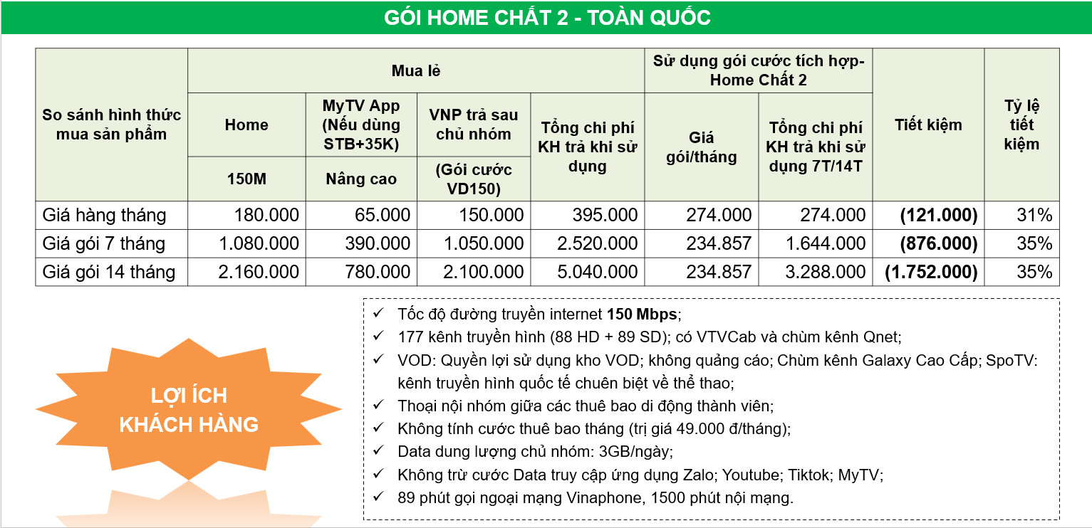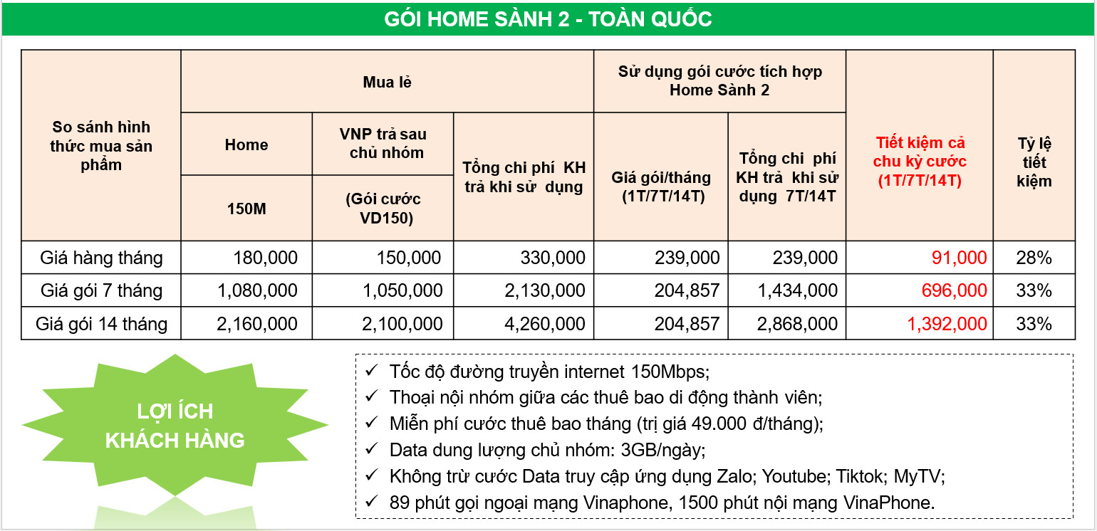- Home Net 2: Tốc độ 150Mbps, giá 180k.