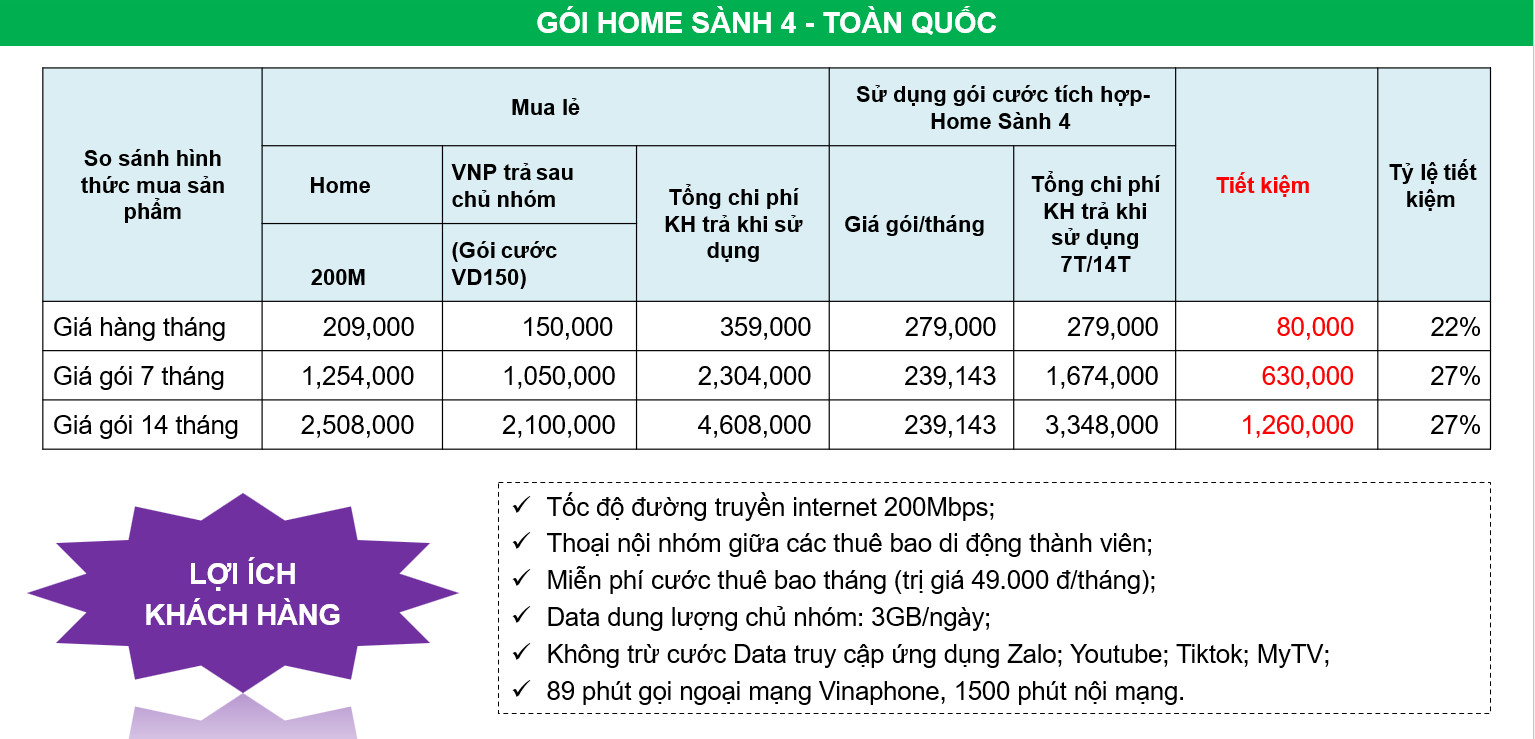 - Home Net 4: Tốc độ 250Mbps, giá 219k.